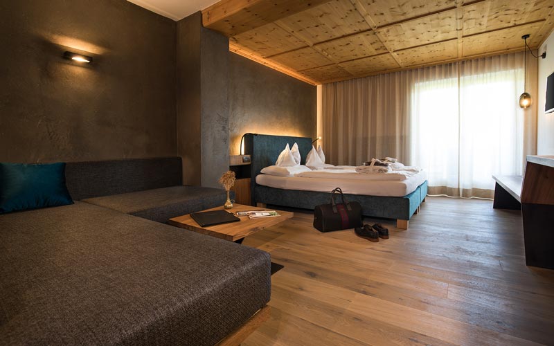 In unseren komfortablen Designzimmern wohnen Sie stilvoll und entspannt. Genießen sie Ihre gemeinsame Auszeit in unseren Wellnesssuiten mit privatem Whirlpool, eigener Sauna und traumhaftem Dolomitenblick.